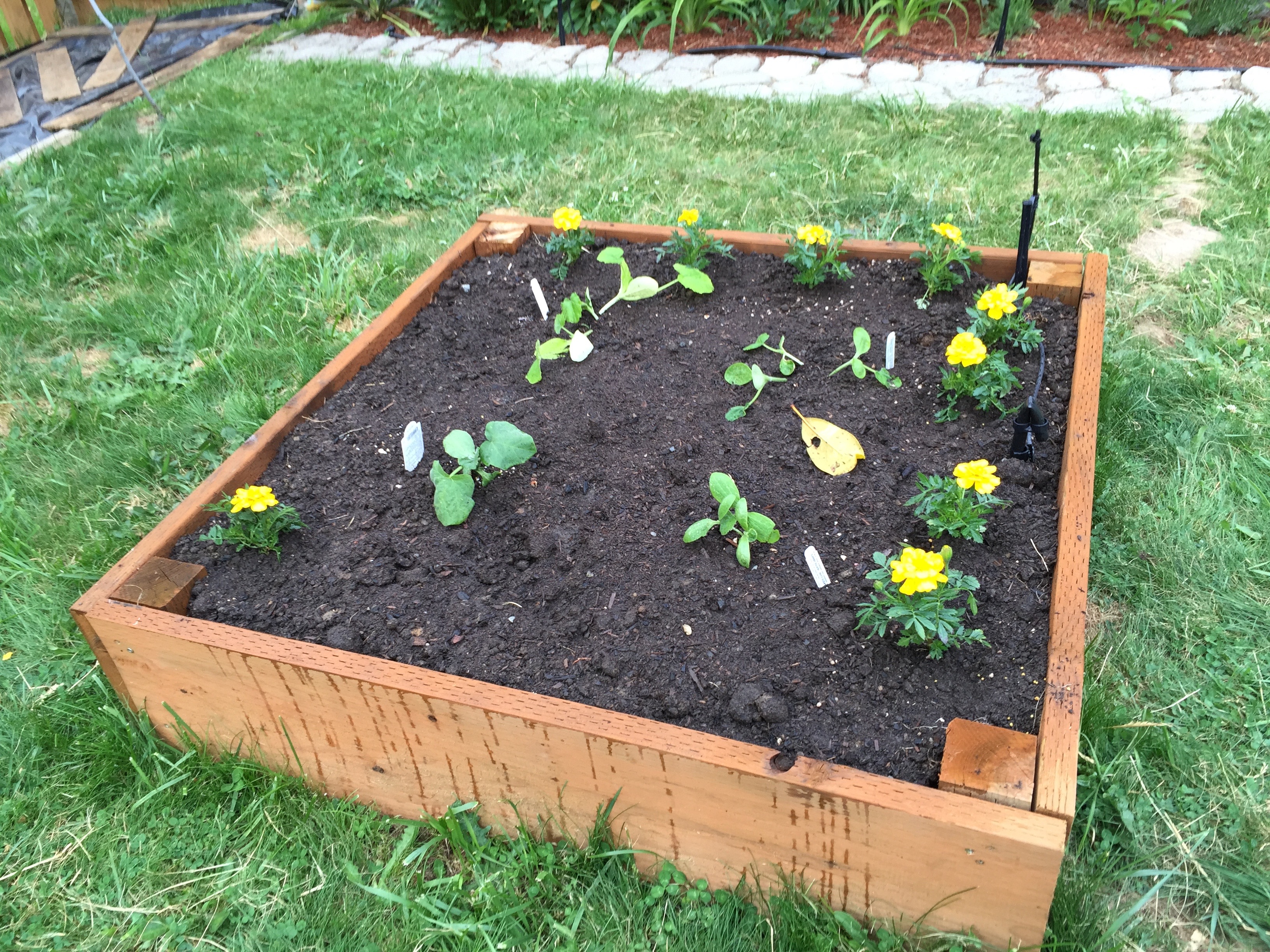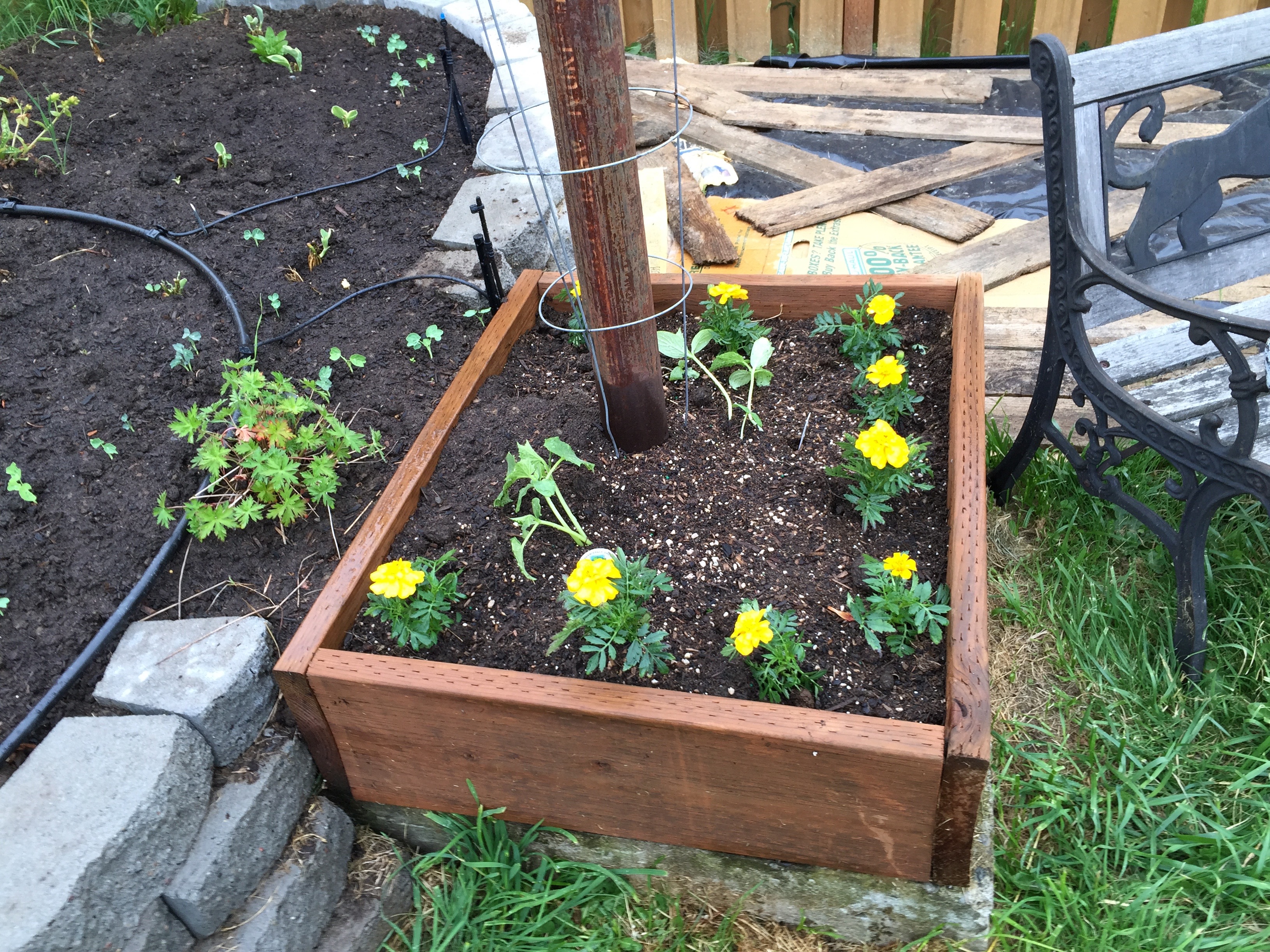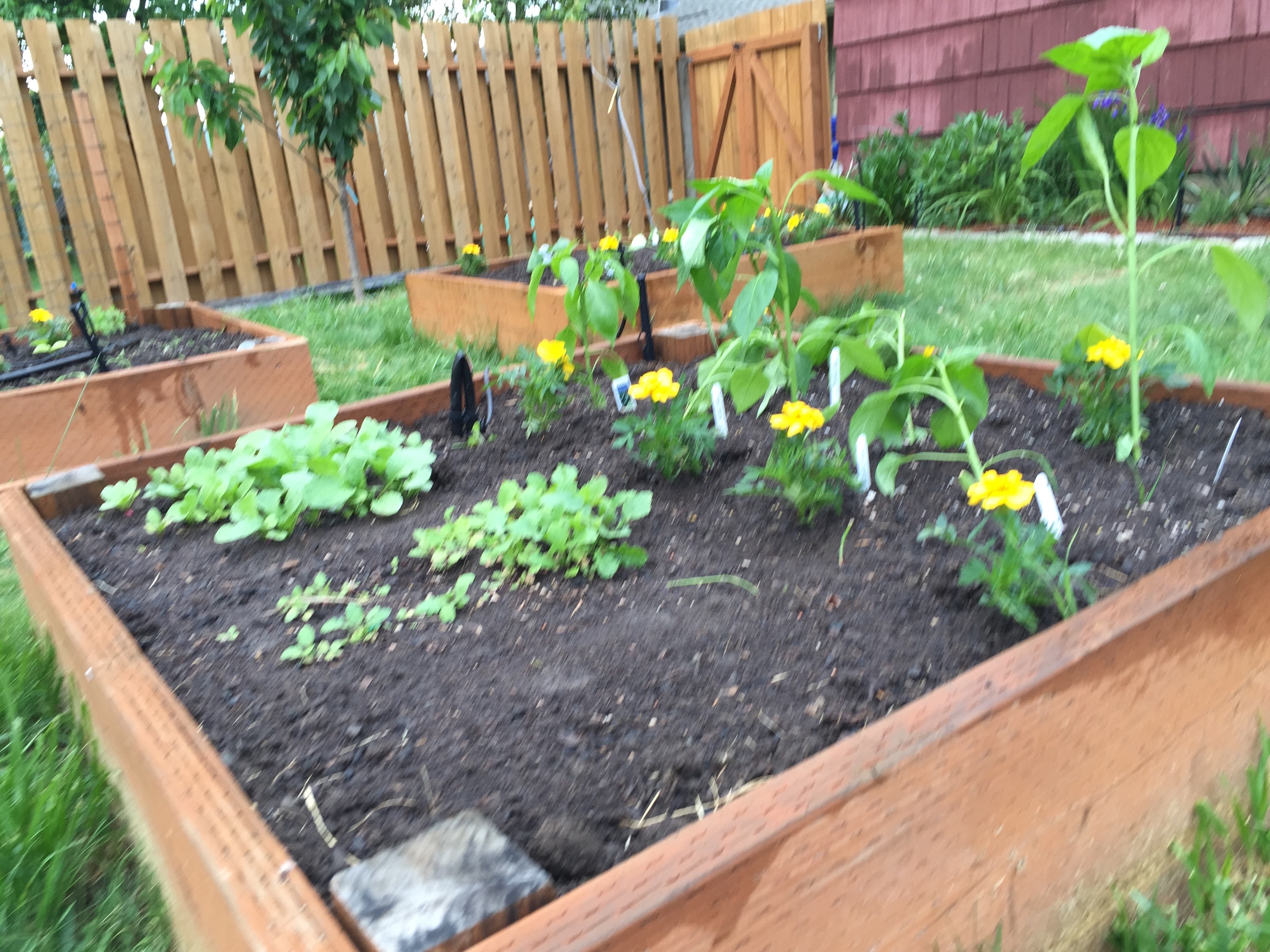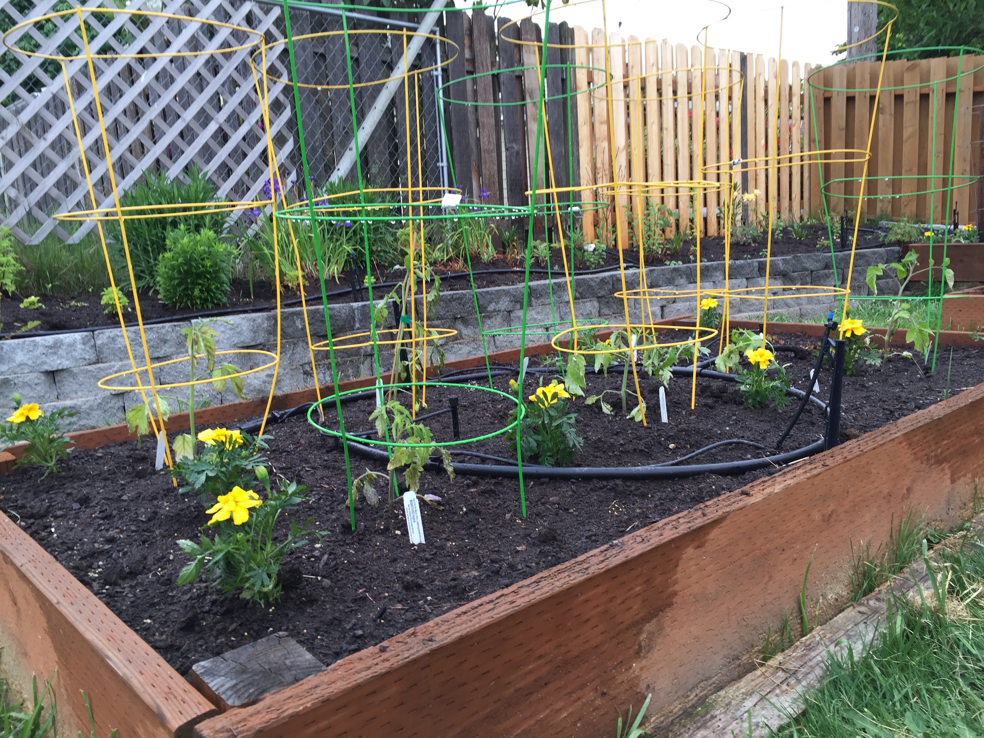 Tomatoes — 8 different kinds (Stupice, green zebra, lemon boy, orange, San Marzena roma, Pink, Brandywine). May be too many but I love tomatoes and they freeze well. Carrots and beets planted on the edges.