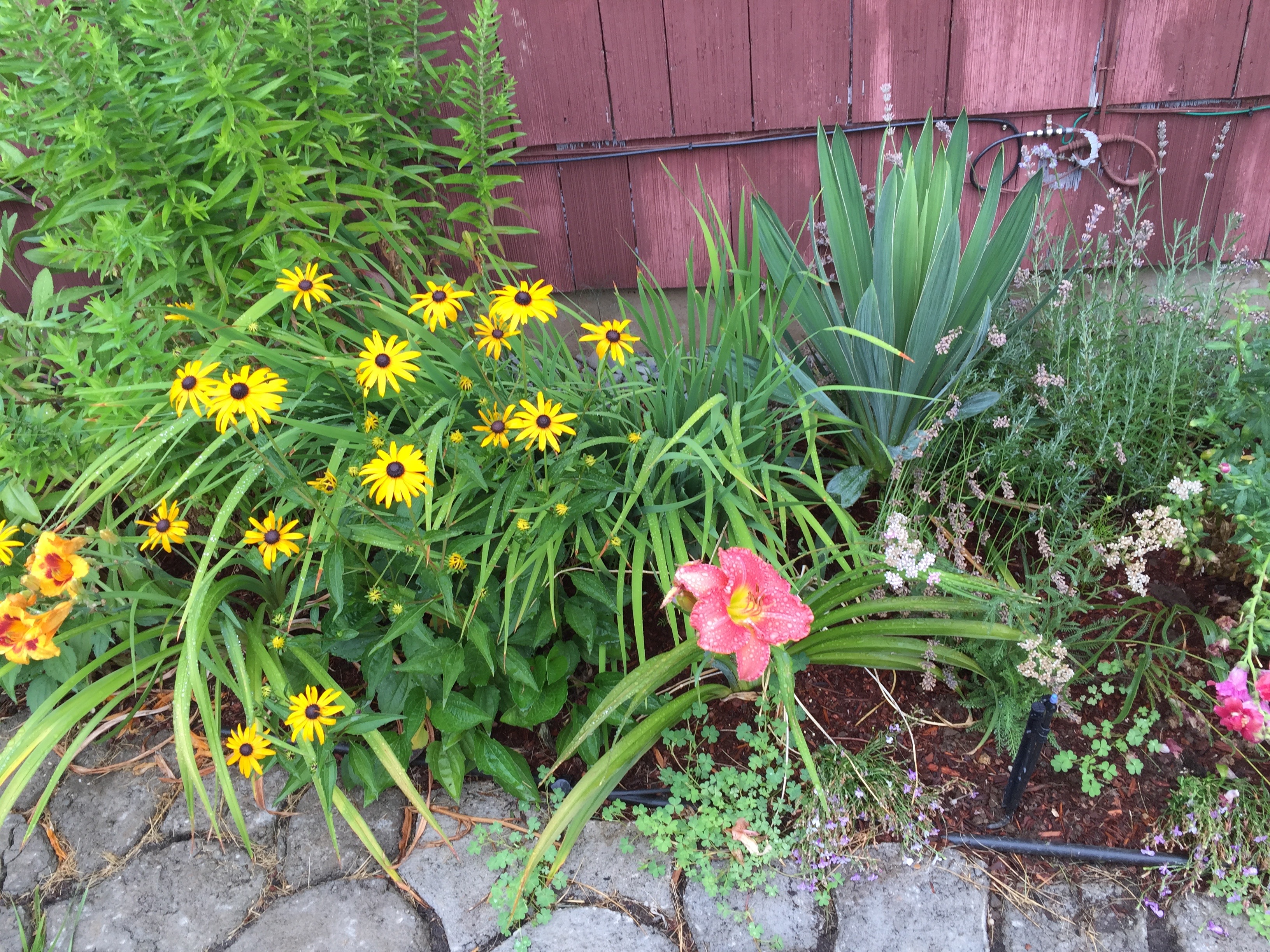 The bed along the back to the house filled in very nicely this year, thanks to regular watering. Lovely lilies and back-eyed susans.