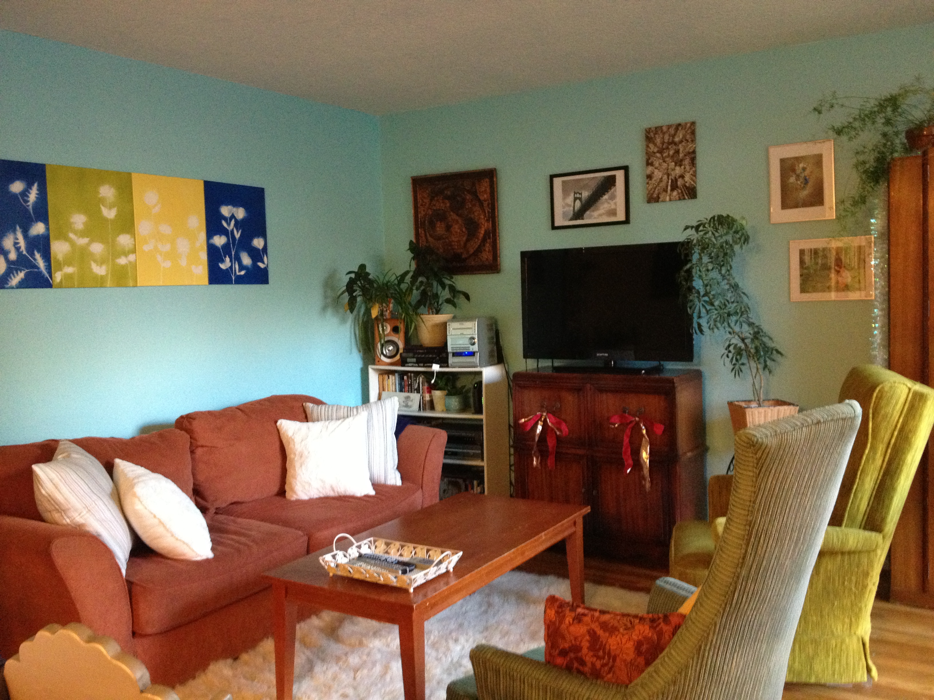 Anyway, I needed some new art for my walls, particularly the living room. I nabbed up some cool stuff at an art festival when I was in Phoenix visiting my sister Gretchen and brother Kevin and his family. But I needed a big statement piece for over the couch. Big art can be expensive, and I am poor. To Pinterest I wandered. I found some cool canvasses that looked easy to make — simply lay silk flowers on a white canvas and spray paint. I can do that. WRONG. The paint bled through the silk and the canvasses just ended up being basically one color. Good thing I have all of that white ceiling paint hanging around. I took some and basically ended up painting the flowers in by hand. If you don’t look too closely, they look pretty good. But another classic example of things not turning out “quite right.” oh well.