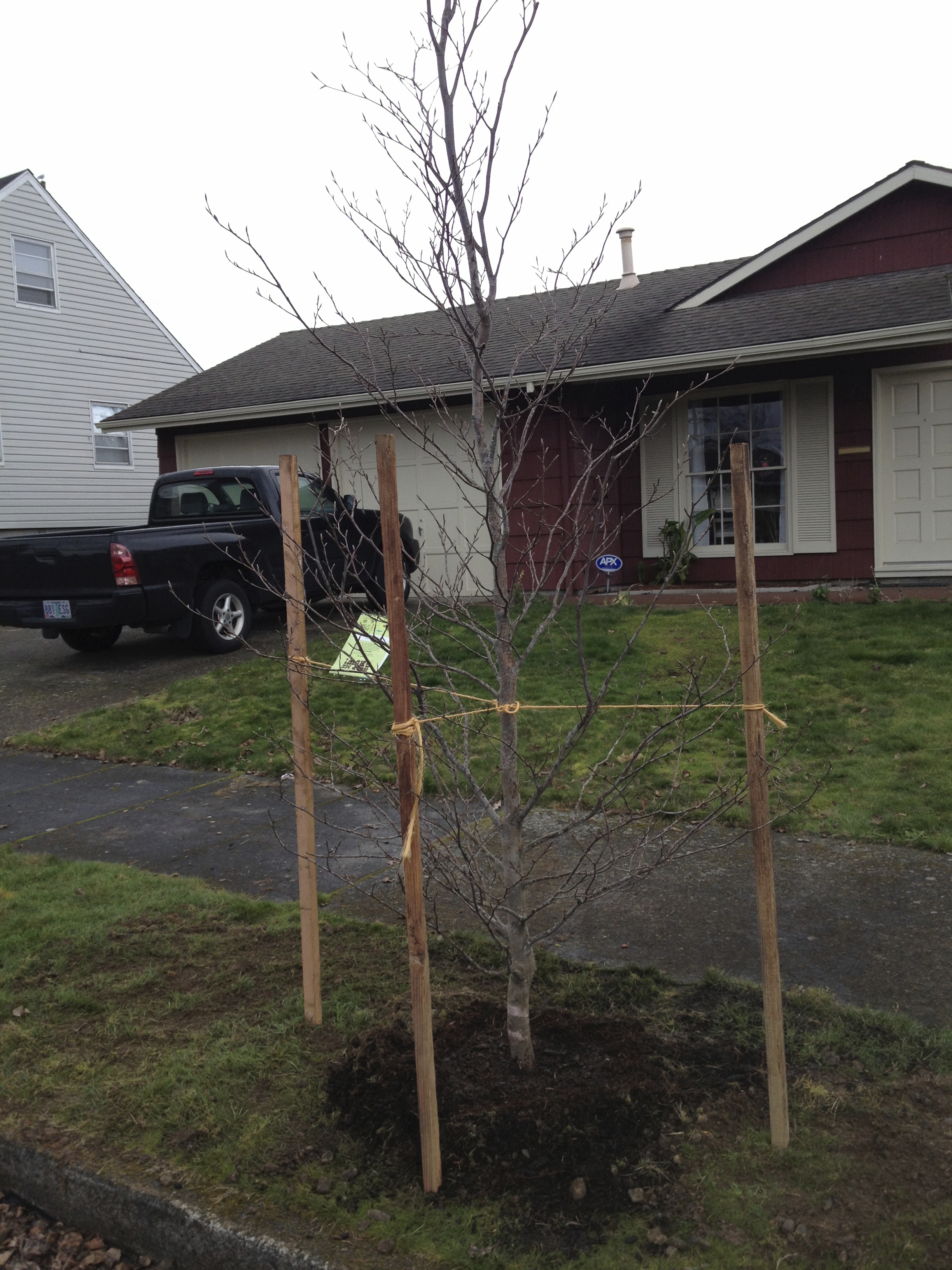 Saturday I got to reprise one of my favorite adventures — planting trees with Friends of Trees. I’d like to say it was as awesome as the first time I did it a few years ago when I got the flame maples at the Rex, but sadly, not as awesome. They seemed much more unorganized this time and my team leader was annoying. He didn’t really tell people how to plant a tree and just wanted to pontificate about useless blather. And because no one else on my team had ever planted a tree beside me and blathery guy, I felt like I had to be either bossy or do all the work — my least favorite situation. And the lunch when we got back was really lacking — most of the food was gone and they would only let you have one little dab of your choice — bowl of soup, slice of pizza, hunk of sandwich — which is not cutting it folks. You work hard for 4 hours you want more than a little nibble. Disappointing.