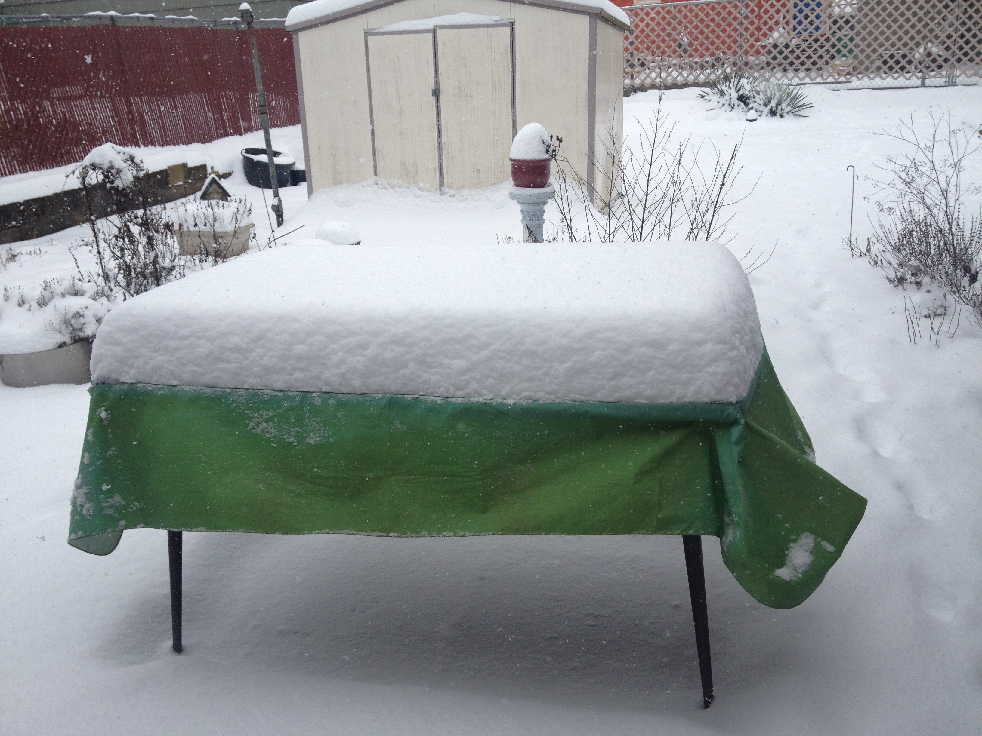 But this is one of the worst storms I can ever remember! Even when I lived in Colorado. And it is even worse because Portland and Vancouver don’t have the tools to deal with it. It started on Thursday morning, catching most people off guard and resulting in horrific traffic problems (dozens of accidents and a 30-car pileup where a man was killed). By the time I left work Thursday night, the roads were basically empty of cars but it was still slick and scary. There was 5″ on the back patio table. But Lily and I had fun shoveling the sidewalk.