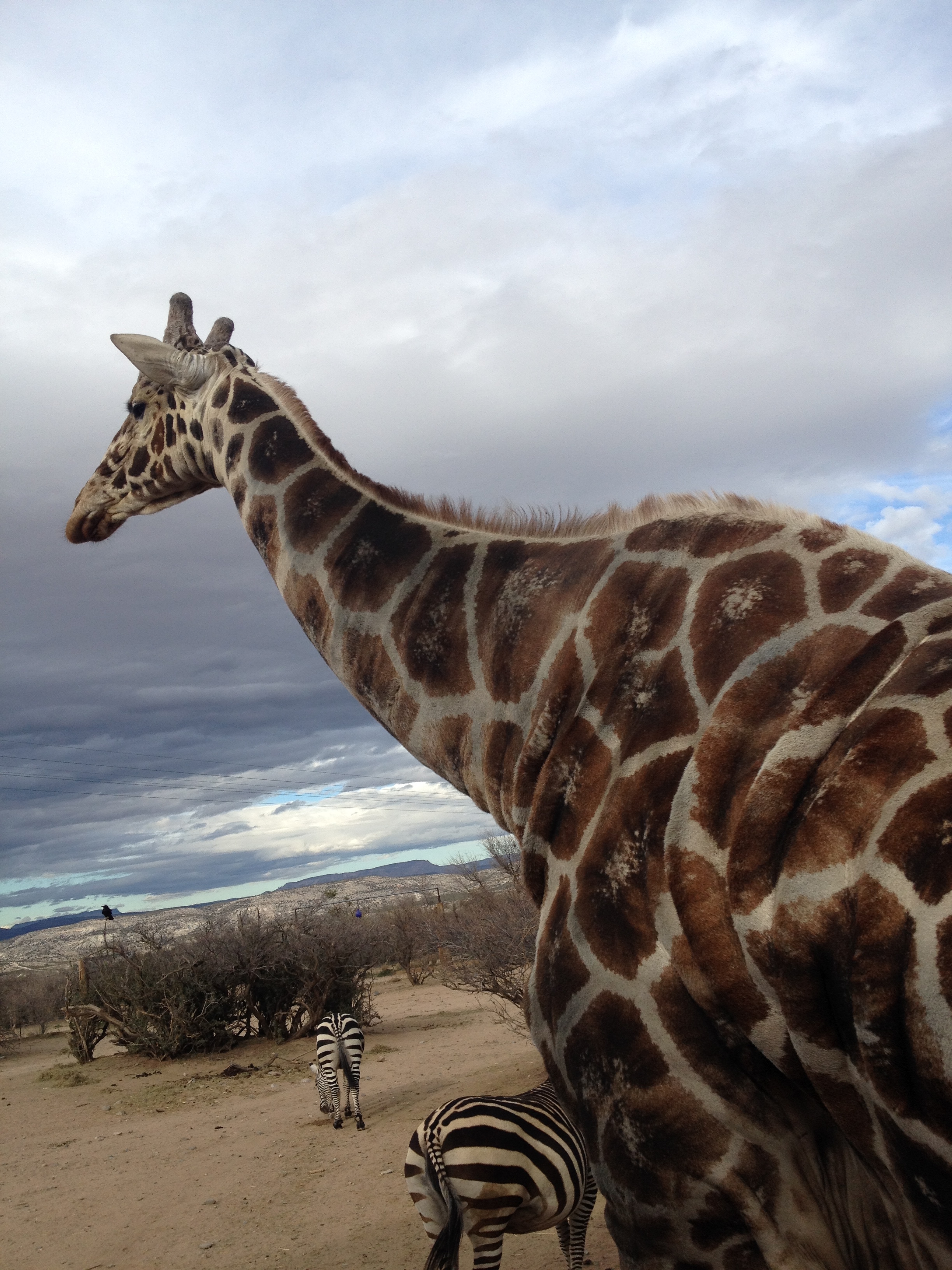 After following the meat truck, we went into this enclosure with the vegetarian animals — antelope, zebras, ostrich, and giraffe. They gave us a leaf to feed the giraffe and you could hold it out with your hand or put it between your lips and they would “kiss” it off with their 16″ tongues. The first one we met rejected me.