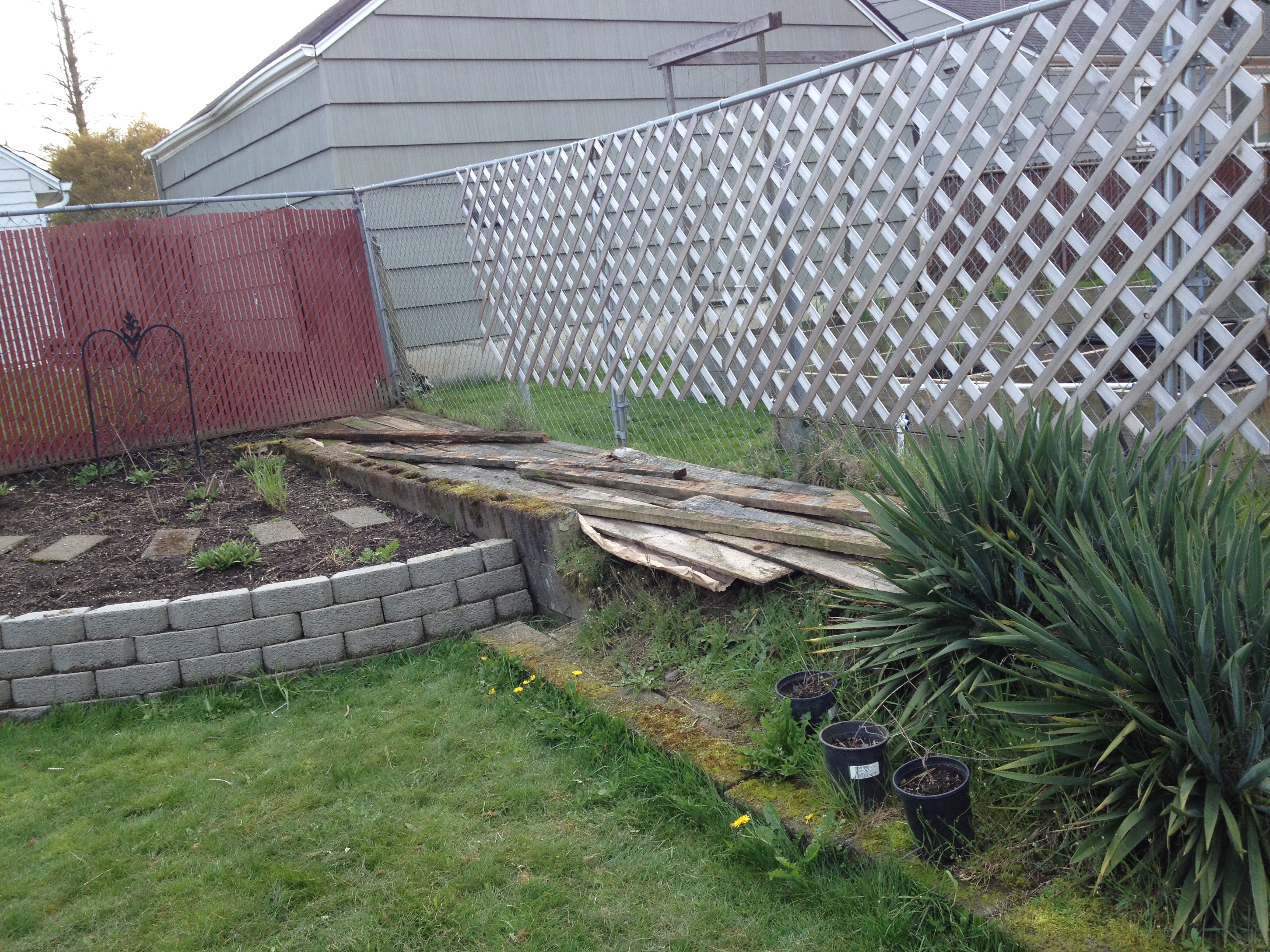 But back to my wall woes. North of the retaining wall bed there is a section of old wall that fell down. I decided that it would be fun to build some steps and pillars to the back area along the fence. The first part of the project happened when the old fence fell down. I took some of the old board and cardboard and covered the weeds along the fence.