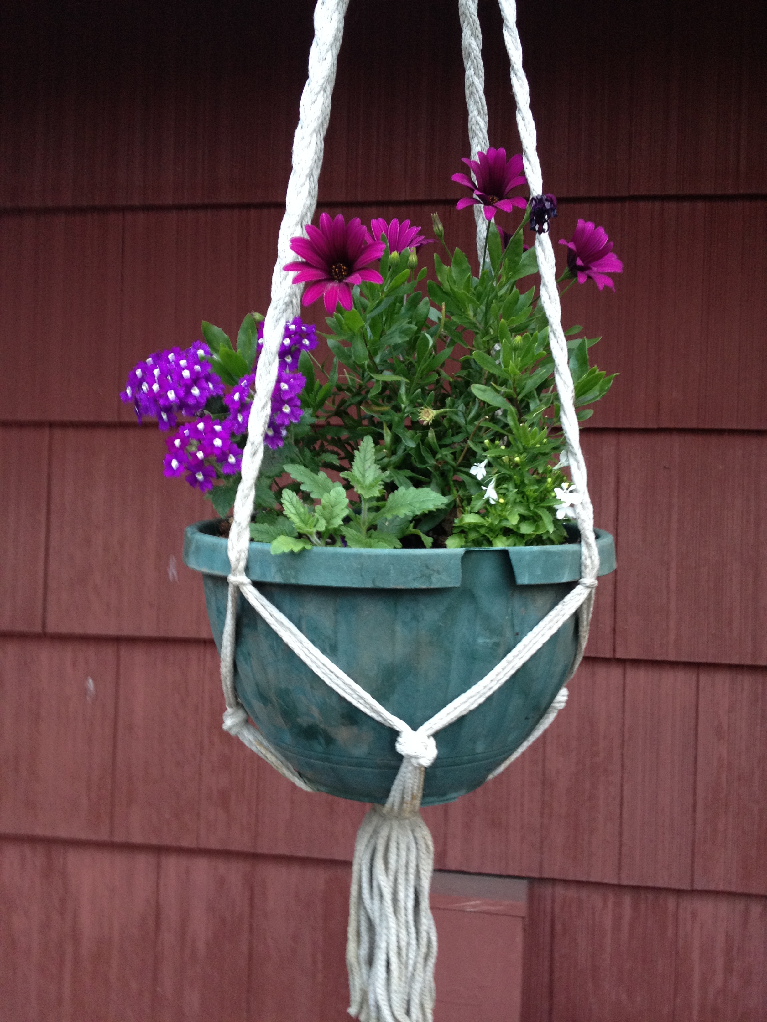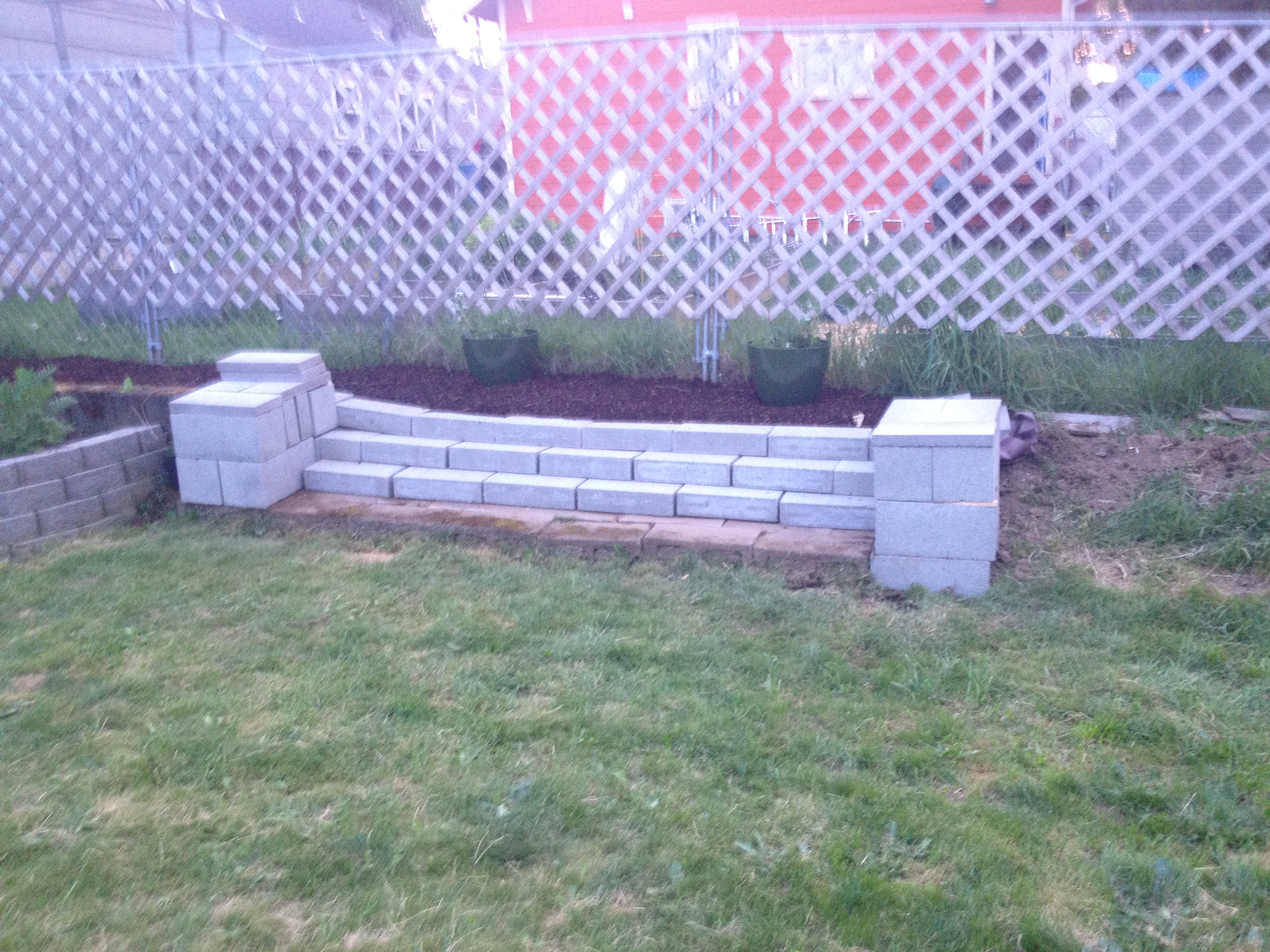 Steps and pillars done. Weed clothe and mulch laid. pots planted with honeysuckle, snap dragons and verbena. Green pots to blend in with neighbors weeds.