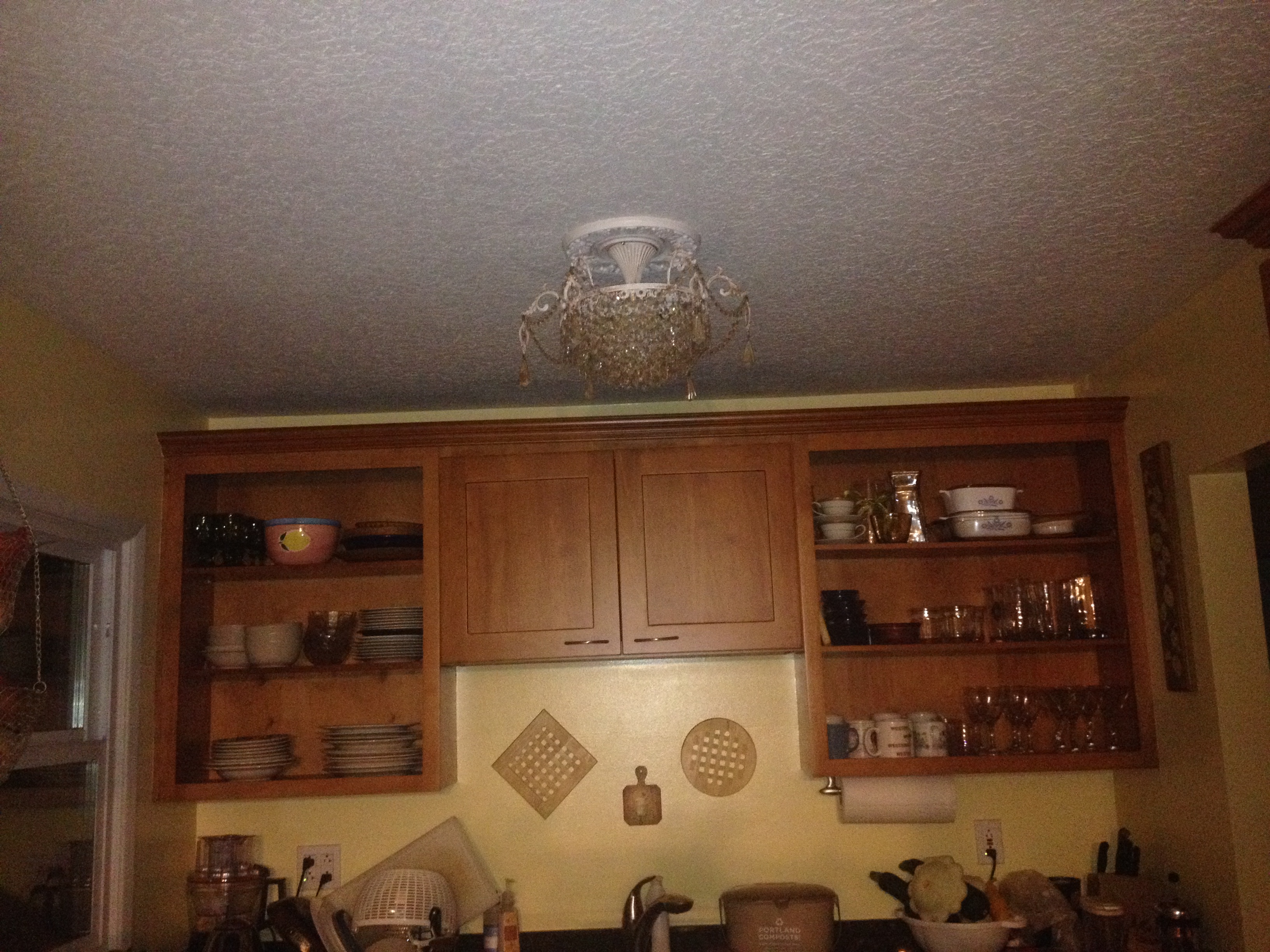 Good to know I am smart enough to swap out a braker — could be handy to know at some point. I think the wiring in the kitchen used to be controlled by 2 switches (both on different lines, which is super strange.) Anyway, 4 hours on a ladder and trip to the hardware store in the middle and I finally got it hung.