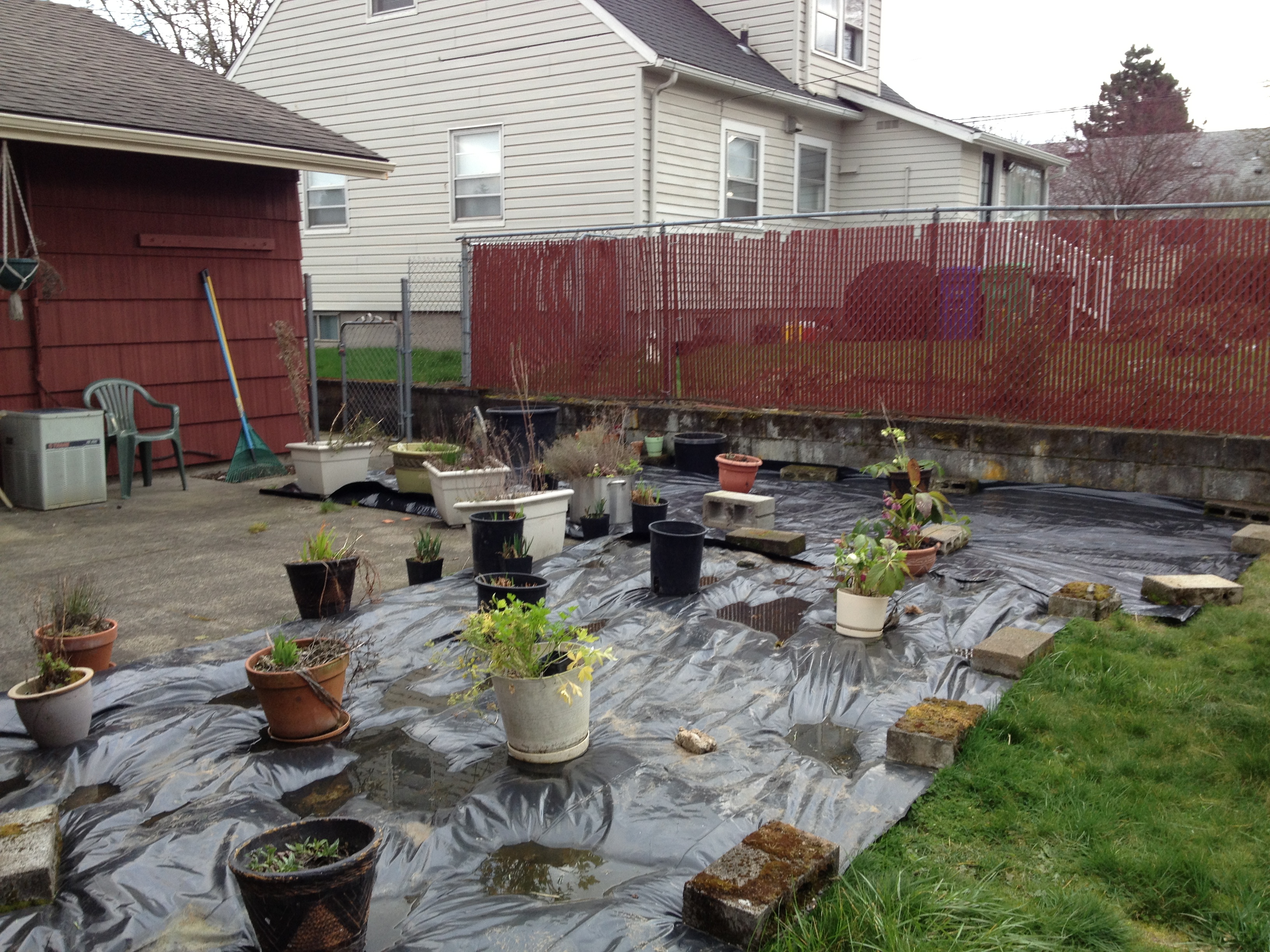 I laid black plastic to kill the grass and put all of my pots I moved from the other house and random bricks for the crumbled retaining wall to keep it in place.